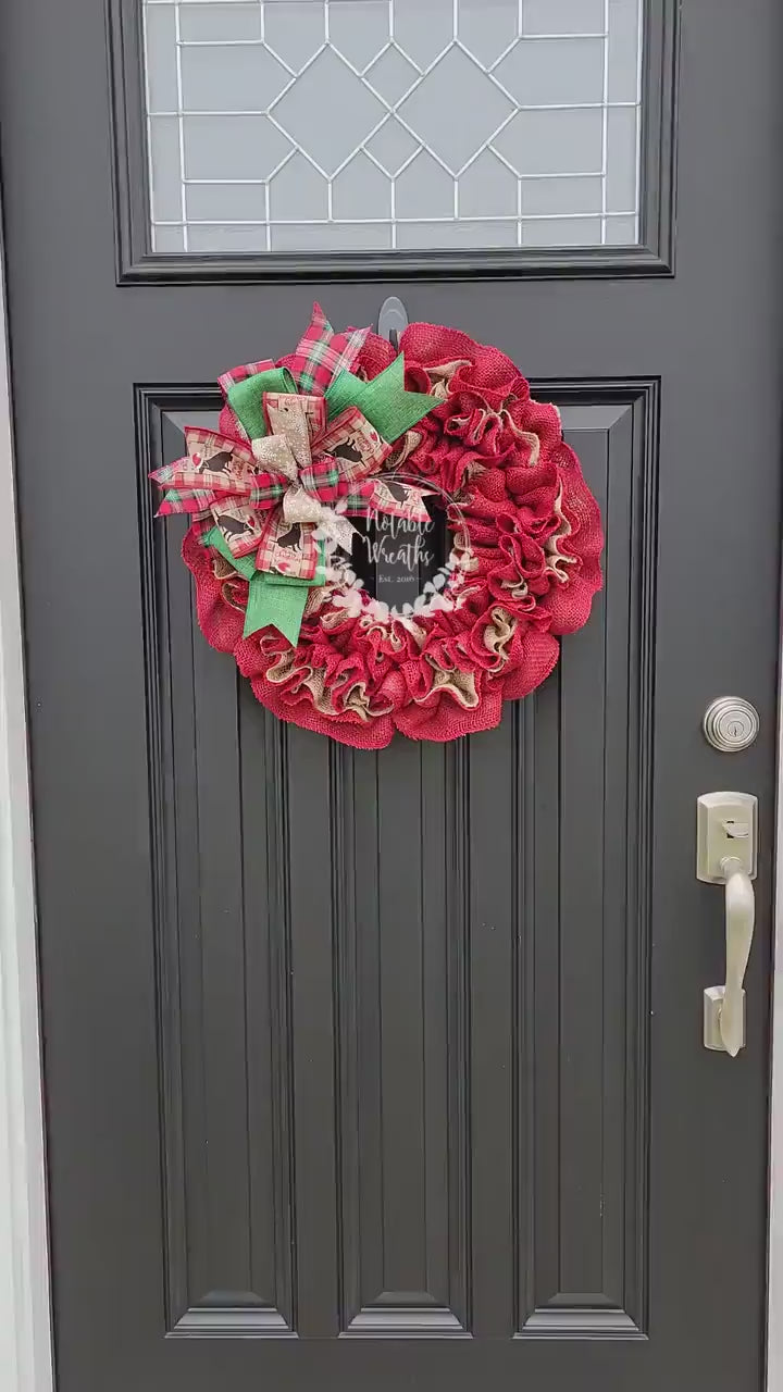 This wreath is made on a wire frame using crimson red and natural burlap done in a ruffle style.