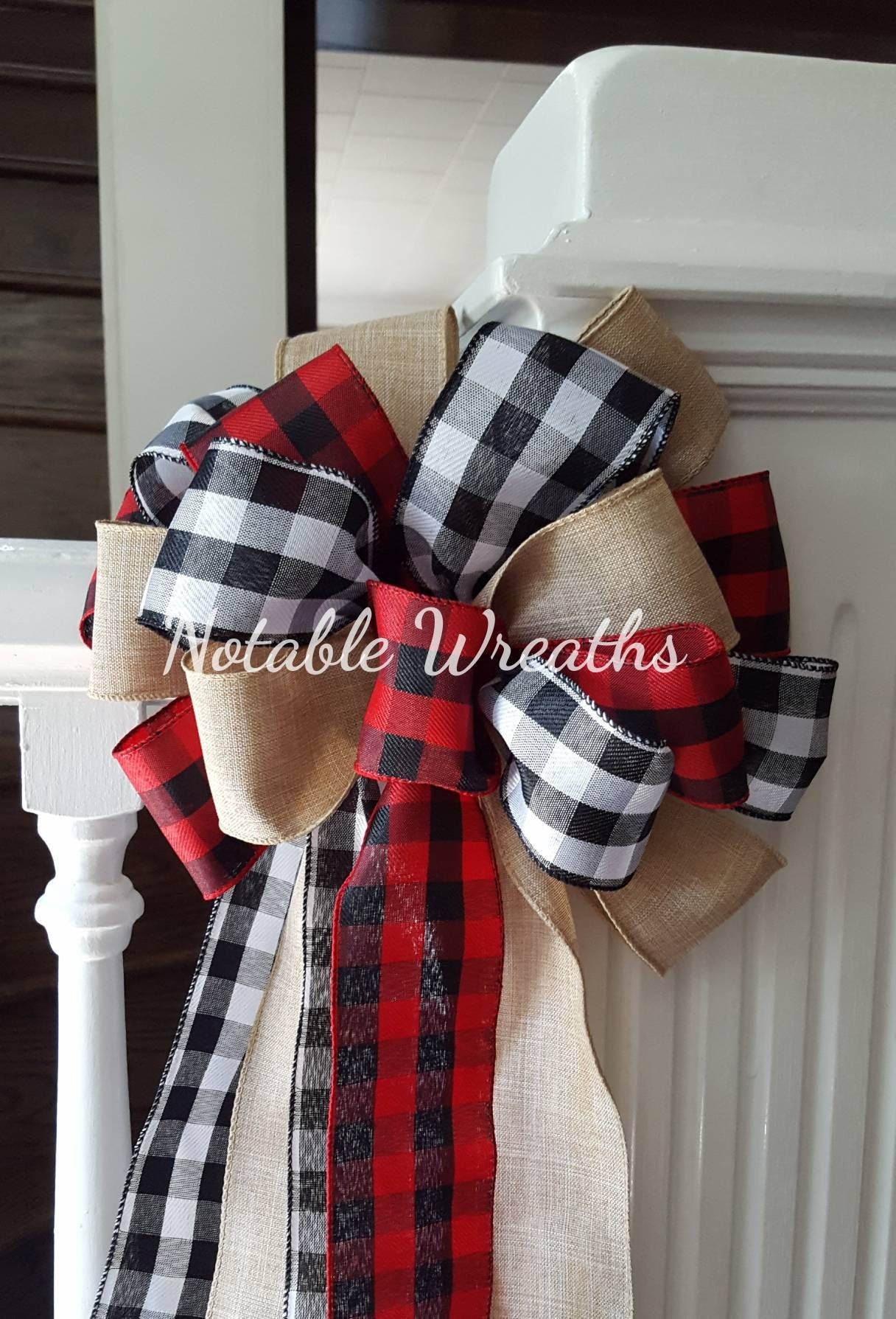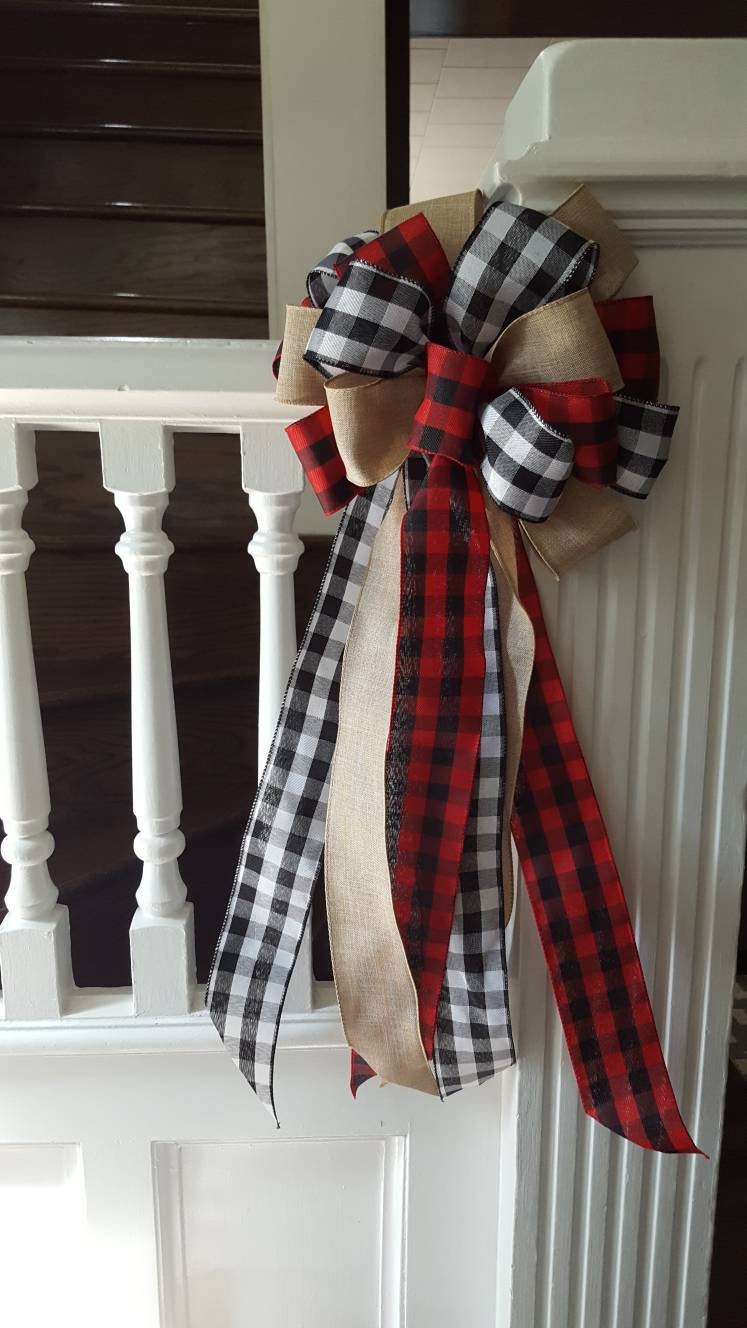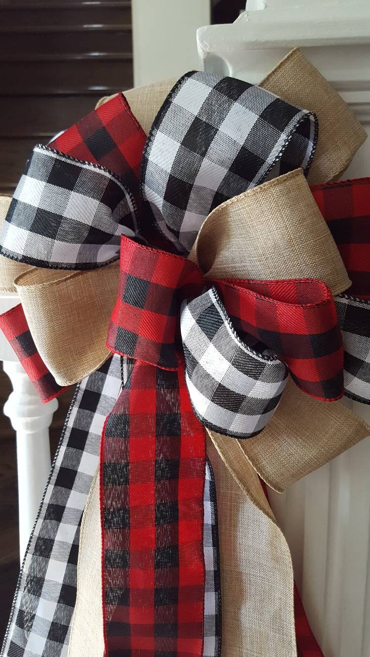 Rustic Christmas tree topper bow, plaid tree topper bow, farmhouse decor, red and black buffalo check tree topper, Christmas tree decor