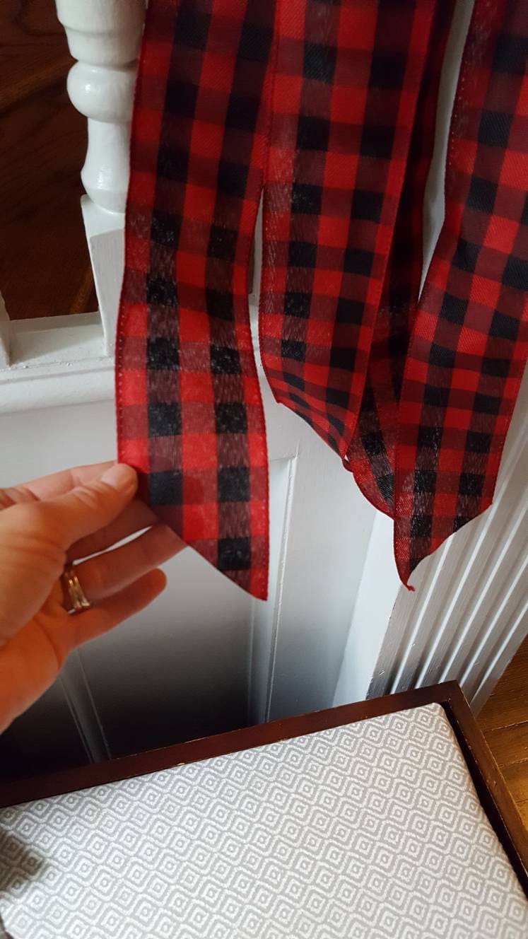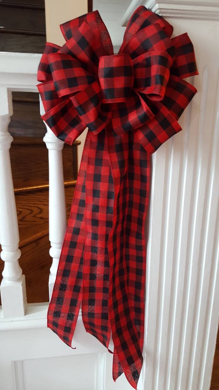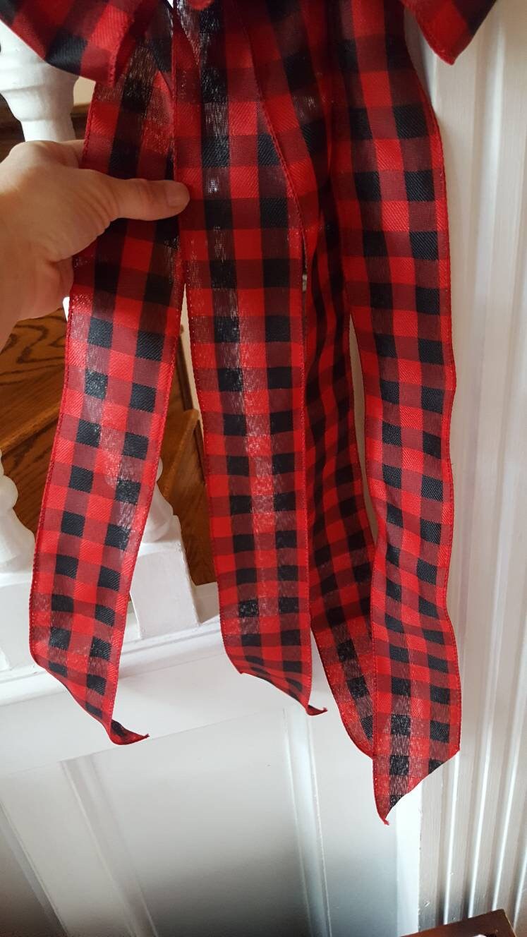 This modern, yet rustic bow with four tails is made with red and black buffalo check plaid ribbon and measures at around 10"W x length chosen at checkout (measurement taken from top of bow to bottom of tails.)